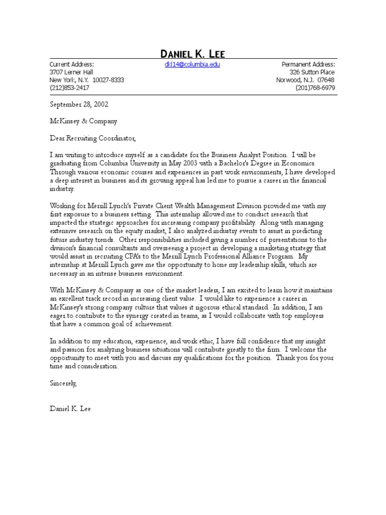 Short Cover Letter For Business Analyst - As a business analyst, you know the power of information and how it affects the decisions you make.. A business analyst is a professional whose primary duty is to oversee the effectiveness and consistency of the operations followed within an organization. Writing a great business analyst cover letter is an important step in getting hired at a new job, but it can be hard to know what to include and how to format a get inspired by this cover letter sample for business analysts to learn what you should write in a cover letter and how it should be formatted for. This written introduction to your potential employer expounds on your relevant professional skills at a level not possible within the space confines of a. Currently, i am employed as a business analyst at rutger inc. Common duties of a business analysts include.